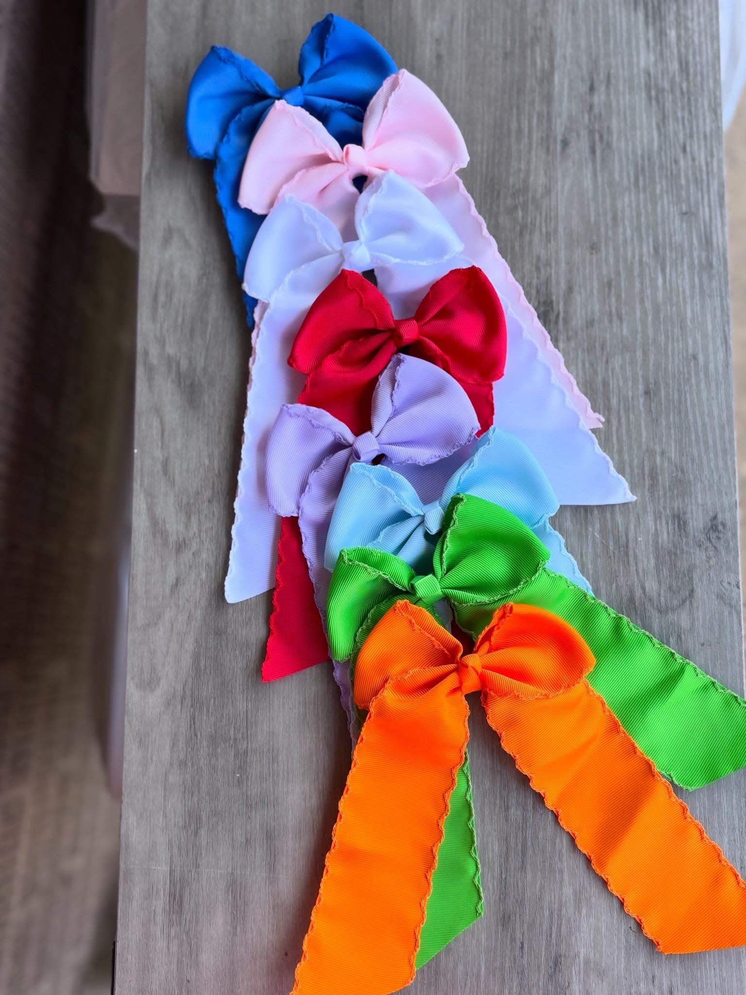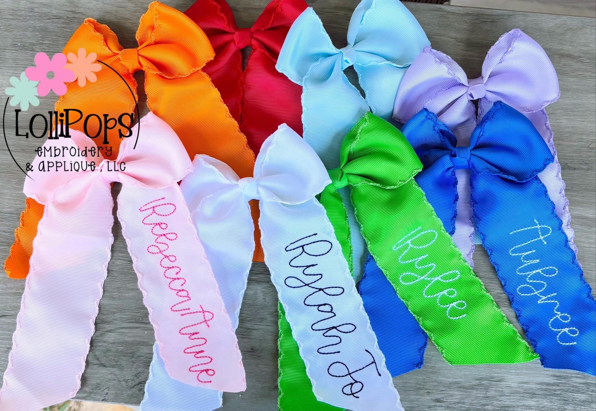 Our preppy long-tail bow size is approximately 6" long, 4" wide with a clip. Made with grosgrain ribbon. These are perfect for embroidered designs, names, or monograms.